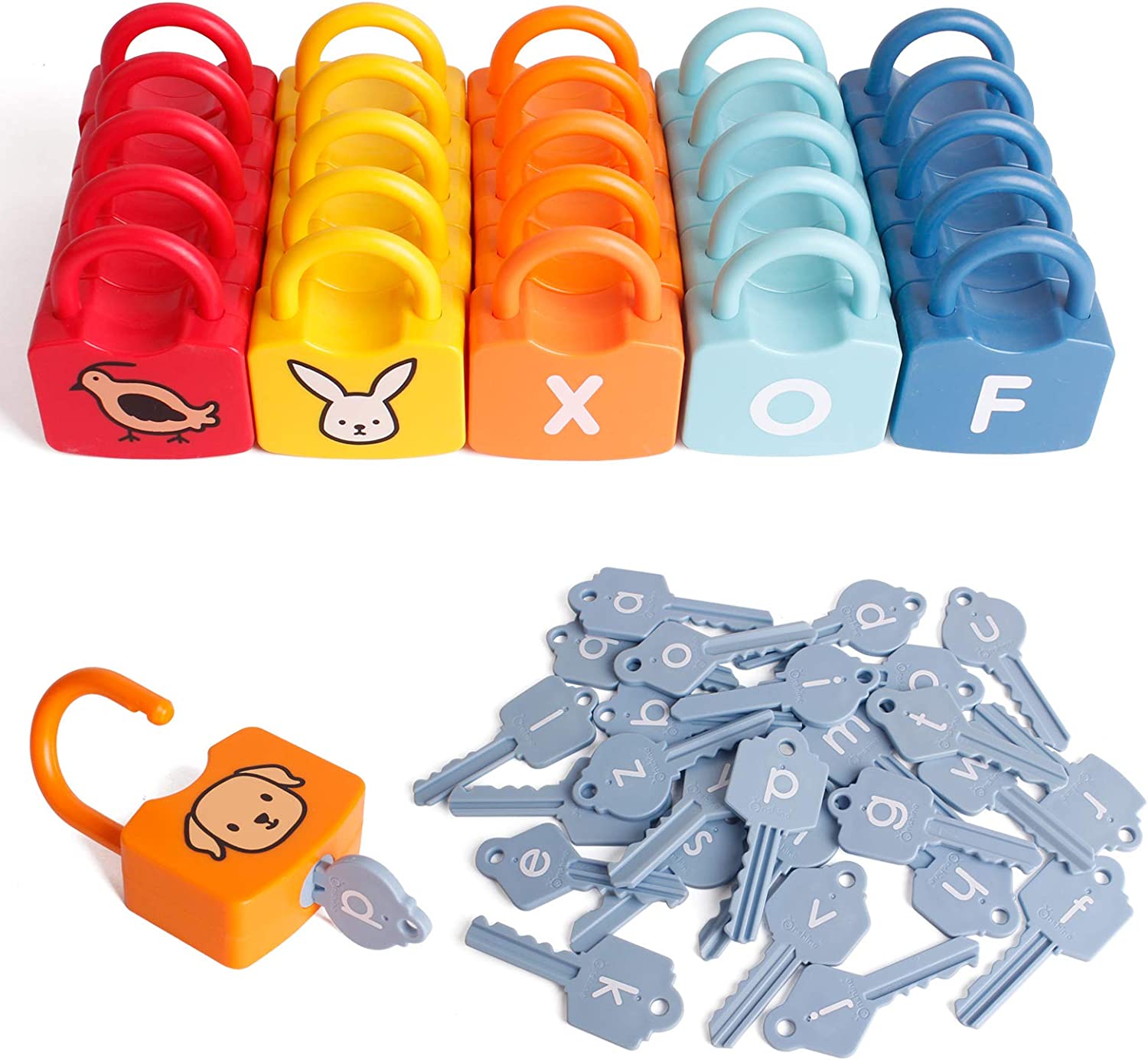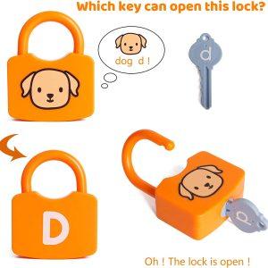 The set includes 26 locks and 26 keys. The front and back of the lock are letters and patterns, and the front and back of the key are uppercase and lowercase letters.