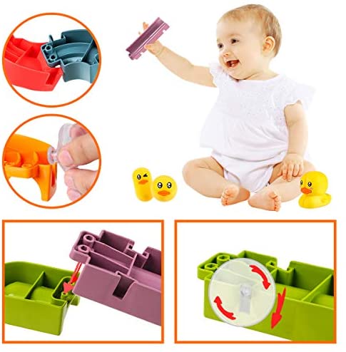 FUNNY TOYS IN FAMILYIt is easy to join the two pieces of the track toy together. During parents busy time, children are willing to play it for a long time by theirselves. During the bath time, this water track bath toys in bright colors are easier to attract kids attention. Kids will be addicted to pouring water along the track and watching the mini duck toys slide down into the bathtub while bathing. Bath time will be more funny for both children and parents. SCOPE APPLICATION-According to the vacuum principle, smooth surface has the best adsorption effect. Kids can assembled take apart water track toys whether they play in or out of bathtub. Its also suitable for window sill, mirror, door or other smooth surface. HIGH QUALITY-Our baby bathtub toys marble runs tracks are made from safe and Non-Toxic material, the smooth edges will not hurt kids hands.The bathtub toys in the shape of orbitals track will more easy to be cleaned than pipe bath toys which is more safe for littles who likes biting toys. Parents are no need to worry about mould. Perfect Gift-This marble runs track toys for bath time is able to develop babies hands-on skills, imagination, creativity, hand-eye coordination ability and improve their color perception. It is a perfect gift/prize for toddlers. 37 PCS PACKAGE -20* colorful track pieces(random color),11* suction cups,6* mini duck toys(It contains small parts. Please take care to prevent kids from accidentally swallowing.) The bath toys water tracks are recommended for toddlers 3 age+ to build with parents.