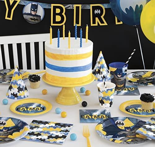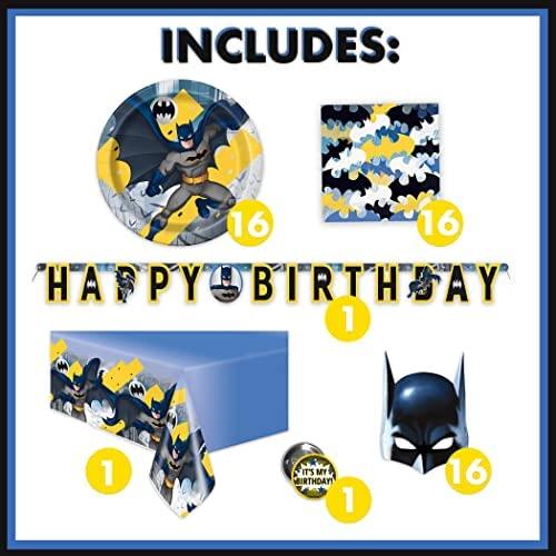 Total Pieces — This premium set includes enough Batman birthday decorations and themed supplies to host and decorate for a party of 16 guests: 1 table cover, 1 Happy Birthday Banner, 16 character masks, 16 large 9 paper plates, 16 paper napkins, and 1 Its My Birthday! button.