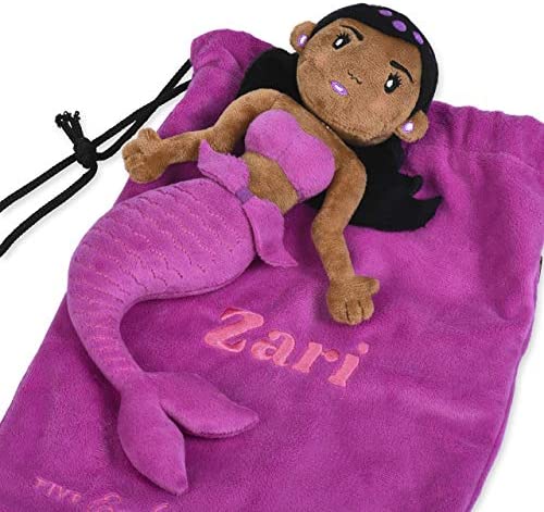 HIGH QUALITY PLUSH MERMAID DOLL & TODDLER BLANKET: This mermaid gift features Zari, an African American mermaid and one of the Five Enchanted Mermaids. The mermaid figure together with a luxurious embroidered bag and the kids throw blanket are both super soft and well made. The mink blanket can be used either as a doll blanket or as a mermaid snuggie PERFECT SIZED TODDLER MERMAID DOLL AND BLANKET: The 11 inch mermaid stuffed animal and the 30 x 40 inch toddler girl blanket have been designed with the little girl age 3 to 7 in mind. The mermaid doll is small enough to carry with her or snuggle at night and the baby doll blanket is large enough to keep a child and her dolls warm and cozy when on the move or on the couch. Both will fit easily into a diaper bag or a small toddler backpack, and are packable and compact SAFE MERMAID TOY: This black baby doll is safe and there are no choking hazards. The mermaid baby doll has been fully tested and a Childrens Product Certificate is available EASY CARE PLUSH MERMAID & BLANKET FOR TODDLERS : Made of 100% polyester, both the mermaid throw blanket and the mermaid dolls for girls are easily cleaned. Simply wipe the mermaid plush with a damp cloth. The kids mermaid blanket can be machine washed repeatedly and will not fade or shrink making it a great toddler blanket for daycare or preschool GREAT MERMAID GIFTS FOR GIRLS: Any little girl who loves mermaids would be thrilled with these mermaid gifts and these make great granddaughter gifts from grandma or niece gifts from auntie. Gift wrapping is available for both the mermaid doll and the mermaid blanket