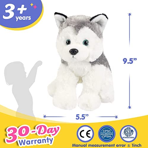 ADORABLE HUSKY PLUSH TOY: Endearing facial expression and beautiful silver eyes engage on an emotional level and make this stuffed husky extra lifelike. It features a fluffy plume tail and a soft, leatherette nose for added realism. HIGH QUALITY MATERIALS: The plush husky puppy is made of super soft fabric which is very comfortable and smooth to touch. Its plastic eyes and nose are stuck firmly and all the stitches are well sewn. So it is durable enough for children’s daily play. PERFECT GIFT: This husky plush can also be used as a decorative piece in a childs nursery. Perfect toy for newborn, infant, boy, girl, and great for babies bedroom decor, animal themed parties or as birthday gifts, baby shower, birthday announcements, Valentines, Easter, Thanksgiving and Christmas gifts for kids. THE SIZE OF THE HUSKY: This husky stuffed animal measures about 12 inches. This husky plush toy is easy to clean and washable. The size of it fits perfect for newborns and infants and will definitely bring a smile to their face. CUSTOMER SERVICE: With customer satisfaction as our first priority, we offer a satisfaction service for all of our merchandise. we strive to provide a shopping experience by meeting your expectations. If you have any problems, please contact us in time. We will give you replies as soon as possible.