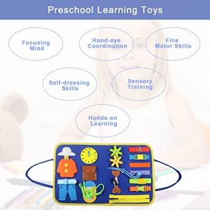 Montessori toysOur montessori toy is a great sensory toy. This busy board encourages kids to play independently, which can develop toddlers focusing mind, hand-eye coordination and fine motor skills, and learn basic skills while playing. It is also a great parent-child toy. Preschool Learning ToysThis toddler activity board is designed with the toddlers feeling as the highest design concept, all parts are designed according to the size of the babys small hands, so babies can operate it easily. The sensory board provides all the items commonly used in life, including zipper, shoelace, button, clock, gear, snap pocket, velcro and more. Soft and SafetyThe busy board is made of felt, and the material is very soft, so you dont have to worry about being hurt by sharp edges like some wooden busy boards. We have reinforced all the parts to ensure that the parts will not fall off in order to keep toddler safe. Toddler Travel ToysLightweight and portable design allows the busy board to be packed anywhere, so you can carry the busy board easily on the go. Excellent portability makes it the perfect travel toy for your baby to play with on road trip or airplane. Perfect GiftOur designers designed this busy board with the theme of space exploration, hoping that toddlers can explore the unknown world while playing. This sensory busy board will make the perfect gift for birthdays and Christmas, as well as a surprise gift for any toddler.