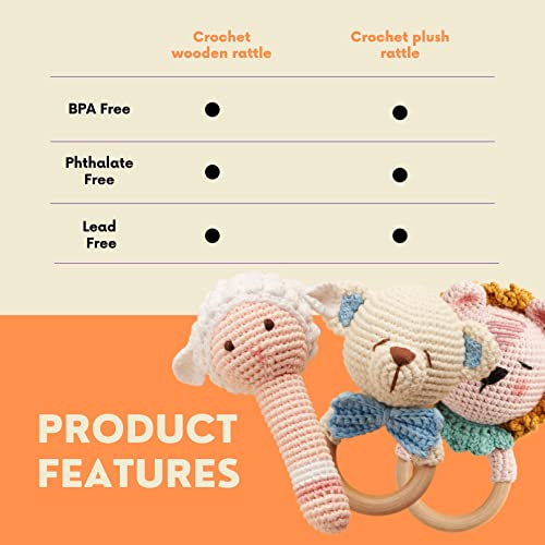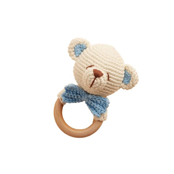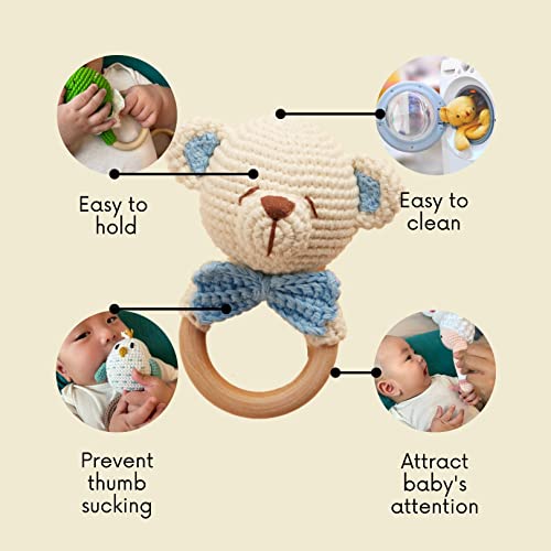 ?100% handmade?Endowed with textile resources in Vietnam, partnered with doll makers with over 10 years of experience, our offers nothing but heirloom quality infant crochet wooden teether rings. Adorably cute crochet white bear woodland animal with blue ears & sleepy head rattle toy and wooden shake ring 2.75/7cm in diameter ?Eco-toy?This crochet bear rattle is handmade from natural pinewood, hand sanded, good for baby using. The bear stuffed plush is hand-crocheted and filled cotton which is relatively soft. Wash with cold water only ? Sensory stimulation?Moving bell inside the baby teething toy make a rattle crisp sound that is perfect sensory stimulation for infants, chubby bear head is soft to chew. As a carseat & crib toys, the lovely bear teething ring attracts babys attention, suitable for chewing and help baby focus while nursing or stay happy with natural teething pain relief ? Unique gift?Cute infant bear teether makes a perfect Easter basket stuffers for both baby boys and girls, or baby shower newborn gift for mom to be and dad to be, Thanksgiving and Christmas gift box ?30-day hassle-free return?All our toddler teething toys are shipped from our US warehouse, return within 30 days if damaged by manufacturers fault. It is our intention to offer the best items and service on