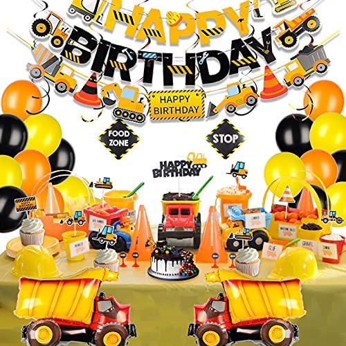 Construction Birthday Party Supplies Dump Truck Birthday Decorations with Construction Truck Foil Balloons, Vehicle Banner and Cake Toppers for Kids Boy Birthday Party 51 Pack