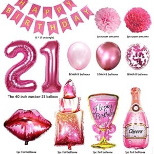 Crenics 21st Birthday Decorations for Her – Hot Pink Happy Birthday Banner, Pom Poms, 21 Number Balloon, Lipstick Champagne Balloons and 24 Latex Balloons for 21st Girls Women Birthday Party Supplies