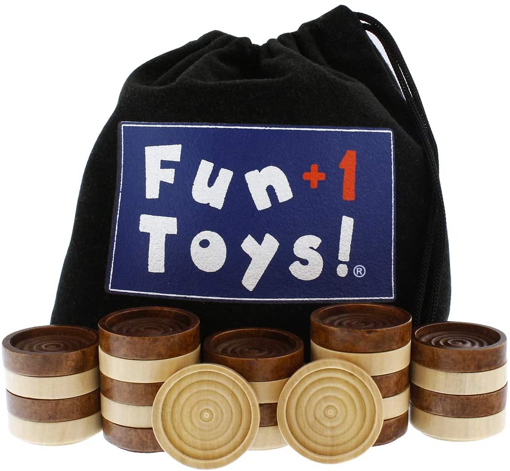 Fun+1 Toys! Classic Wood Checkers Stackable Pieces – Set of 26 Total Checkers Pieces in a Velvet Drawstring Storage Pouch. Each Piece 1.25-Inch Wide and in Brown/Natural Colors.
