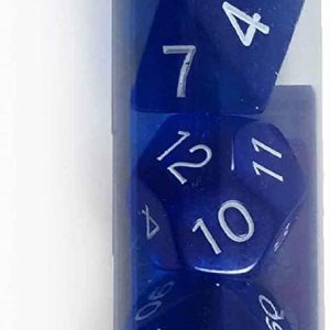 This set is a jumbo sized transparent polyhedrals. Dice included: 1 D20, 1 D12, 1 D10, 1 D100, 1 D8, 1 D6, and 1 D4.