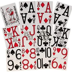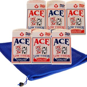High visibility, very large numbered playing cards. Bring back joy of card games for anyone with limited vision. Bundled Items. This is a bundle of 6 (SIX) decks of LOW VISION playing cards. Three with blue backing and three with red backing. Carta Mundi Ace Playing Cards. Cards measure 2.5 x 3.5 inches. Standard size playing cards (referred to as Poker width.). Quality plastic coated cards. Big Bold Numbers are 1.5 inches tall. Club, heart, spade and diamond markers are 3/4 inch tall. Includes Royal Blue Nylon Mesh Drawstring Bag. Measures approximately 9 x 12 inches laying flat. Bundled Items.