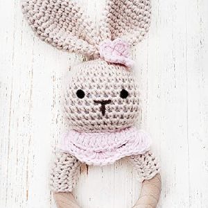 Natural Crochet Teether Toy Rattle for Baby Forest Friends Handmade Amigurumi Crochet Bunny Deer Fox on Natural Wooden Teething Ring Rattle Natural Baby Toys (Girl Bunny)