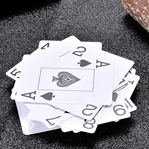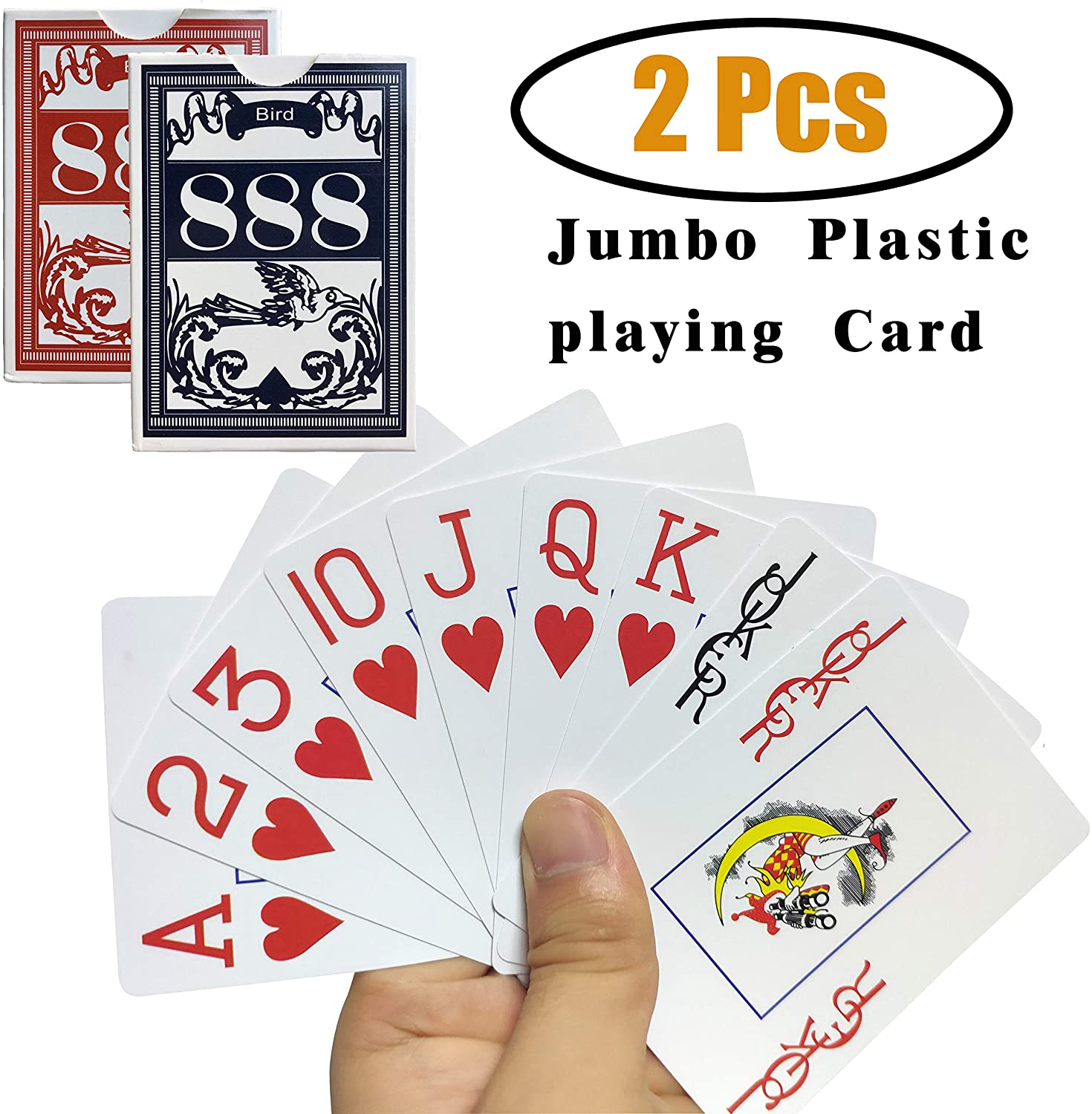 Jumbo index playing cards: feature super index, big face and large number, easy to see, helpful to players with imperfect eyesight, and favored by seniors 100% PLASTIC Playing Cards: durable, waterproof, washable; flexible and easy to shuffle; No worrying about spills from your favorite Tea Playing cards are great for many card games: Texas Holdem, Blackjack, Pinochle, Blackjack, Euchre, Bridge, Go fish, Poker, Hearts and more Premium Waterproof Playing Cards for pool, beach, water games and magic props Each deck contains 52 suited cards and 2 jokers,Poker size (wide size) cards measure 2.5 x 3.5