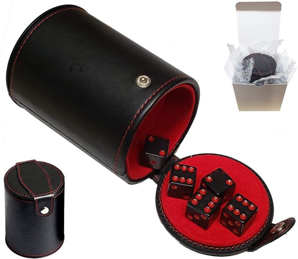 Set of Dice Cup with Storage Compartment Black PU Leather Red Felt Lined + (5) 16mm Tranparent Dice (Gift Boxed) (Smoke/Red)