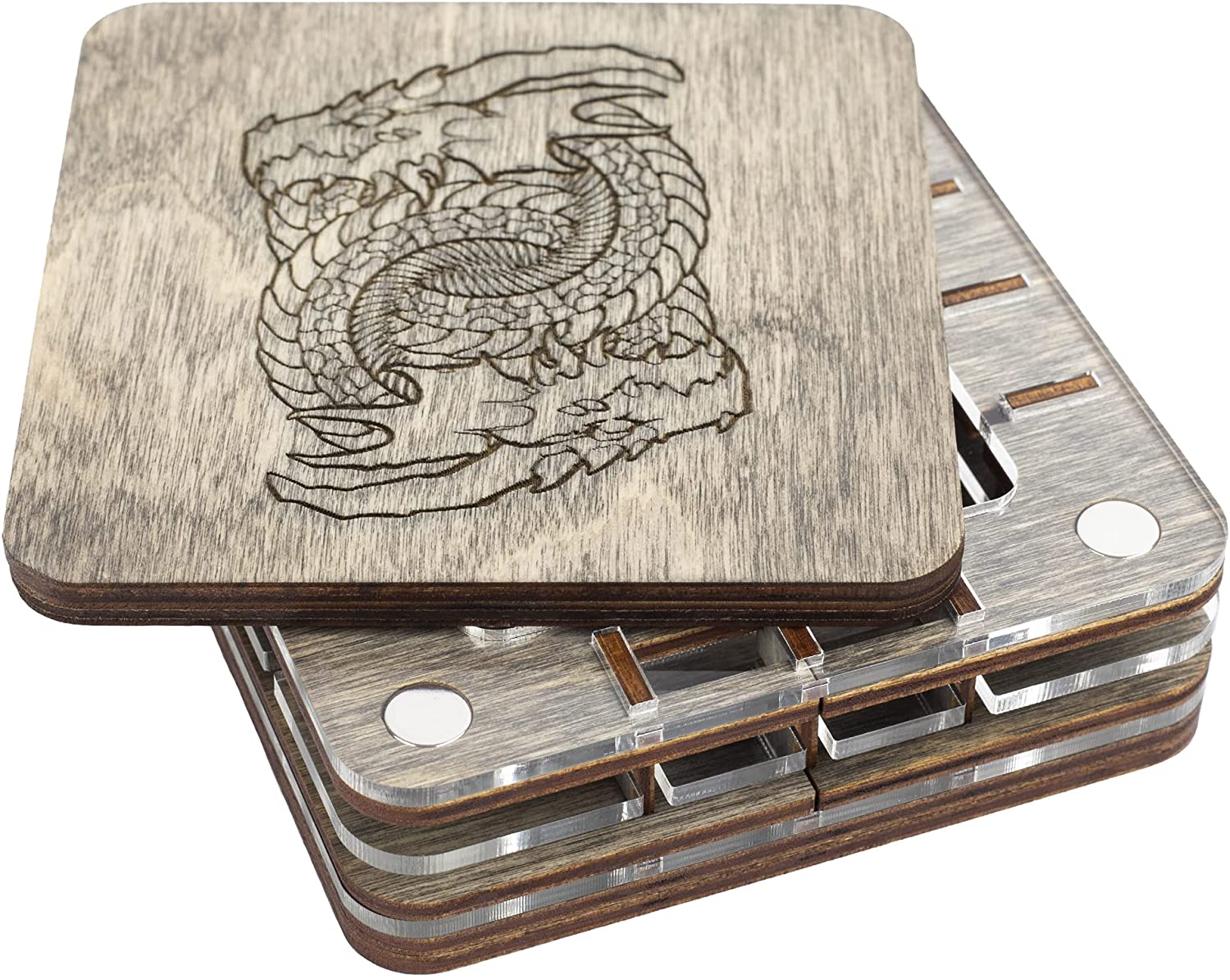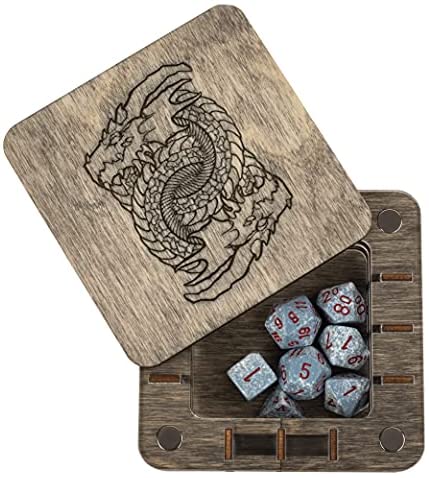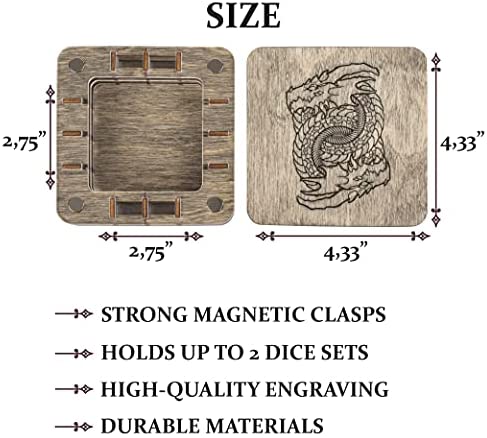 Magnetic fastener:Smonex dnd dice box has a durable construction with a cover on the magnets. Each time you want to play dungeons and dragons you dont have to looking for dice all over the place because our wooden storage box ensures safekeeping to your dnd equipment. Magnetic fixation of wood storage is strong enough, so rest assured that the dice holder is transportable. Natural materials: This dice wooden box is made from natural plywood with acrylic. In addition, we can say that our wood storage box is waterproof. Dice vault has a special water-repellent coating, so nothing can spoil the feeling of the dungeons and dragons world. Our dnd dice storage combines both convenience and absolutely unique design that carries the atmosphere of the game. Good capacity: If you like for a change, there is no reason to worry about your dice sets. Smonex dice case keeps 2 dnd dice set (14 dice), so you don’t have to choose which board games dice to take anymore – take any and all! Exquisite engraving on dnd game storage box looks gorgeous and richly, because we did it with a thin laser, so this wooden dice box is not only Suitable for all rpg dice box: Of course, we develop the wood box design especially for dungeons and dragons, but also you can use it for other board games, for example Pathfinder, Call Of Cthulhu, Shadowrun, Star Wars, Warhammer, Vampire: The Masquerade, Eldritch and many other tabletop games. Magnetic storage is a universal and indispensable thing for game fans. Perfect dnd gift idea: Smonex dnd case can be of use to any player, included dungeon master. It doesn’t matter if you’re in the office with your colleagues or at home with your friends – each of them would like to receive this convenient d and d dice box. Give the pleasant emotions to your close people with our dnd box wooden.