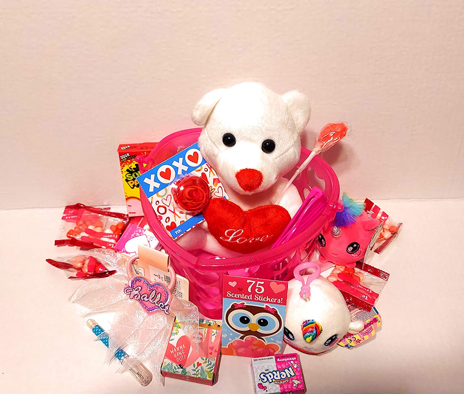 Heart Shaped Basket Red or Pink Colors May Vary White and or Red Valentine Bears Soft Plush Stuff Animal Assortment of Games and Toys, Scented Sticker a TBP Writing Pen