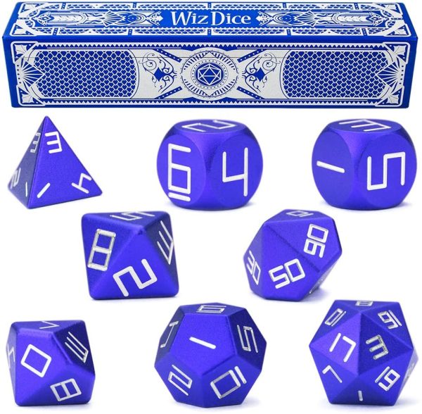 Wiz Dice Set of 8 Masterwork Precision Aluminum Polyhedrals with Laser-Etched Strongbox Choose from 8 Anodized Colors (Cobalt)