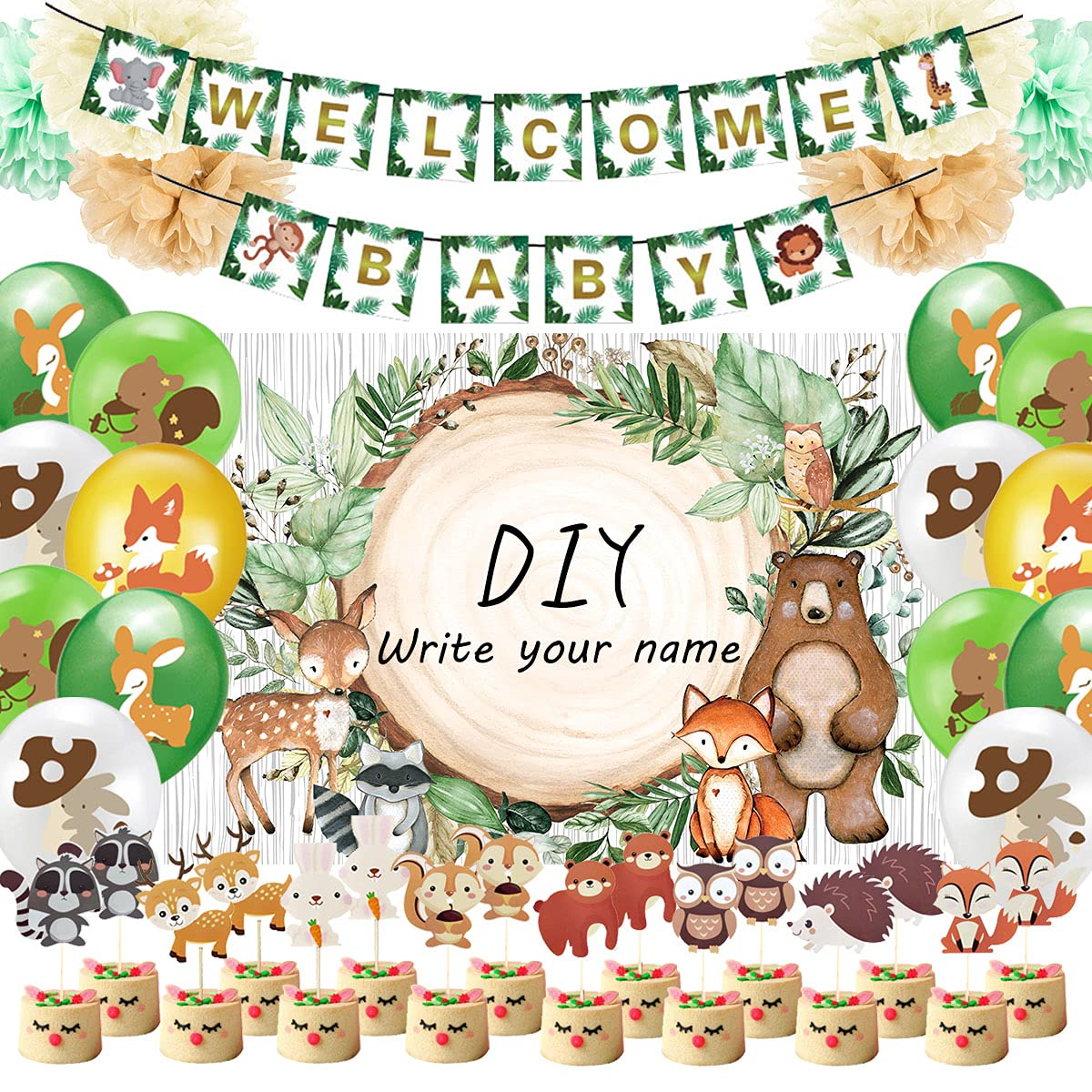 Woodland Animals Baby Shower Decorations Neutral Set Including Banner Backdrop Balloons Cupcake Topper for Welcome Baby Party Supplies