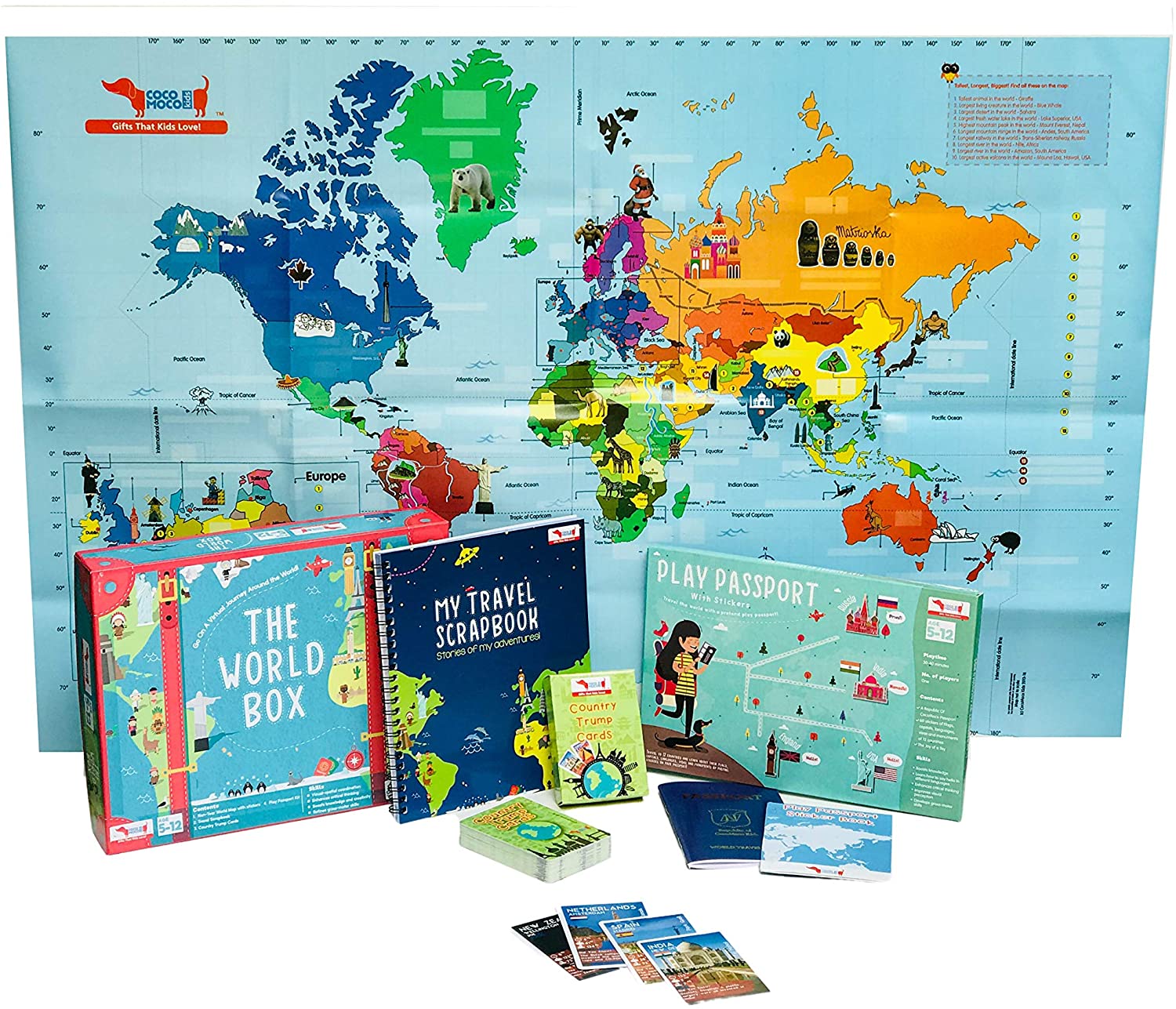 World Box Geography Game with World Map for Kids, Play Passport, Travel Scrapbook, Country Trump Cards Educational STEM Toy for Age 5-12 Years